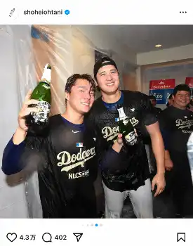 その後大谷は自身のインスタグラムを更新。「リーグ優勝決定Sへ!この調子だドジャース」と英語で投稿しチームメイトとの集合写真や先発の山本由伸投手とのシャンパンファイトでの2ショットなどさまざまな写真をアップ。さらに最後には愛犬デコピンとギリギリまで顔を近づけたショットも公開した。
