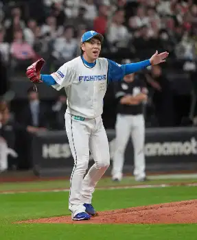 <日・ロ>CSファイナル進出を決めて、宮西(右)とタッチを交わす新庄監督(撮影・尾崎 有希)