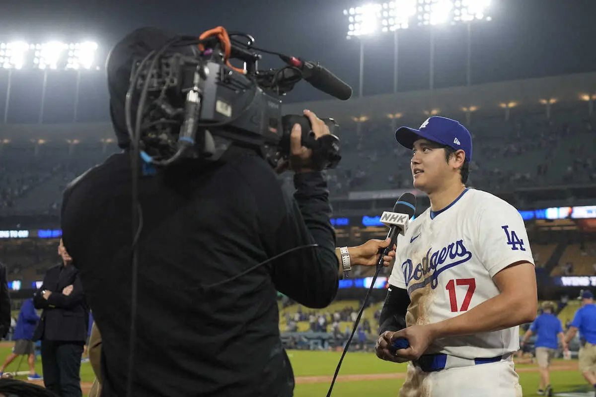 試合後、取材に応じるドジャース・大谷(AP)