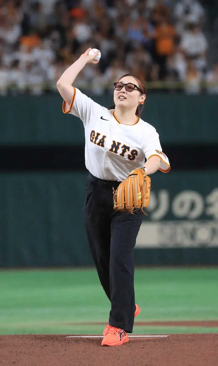 大ファンであるという阿部監督の現役時代の背番号と自身の誕生月にちなんで背番号10のユニホーム姿で登場。「緊張したけど感慨深くて涙が出そうになった。なんとかキャッチできるところまで届いて安心しました」とワンバウンド投球を振り返った。
