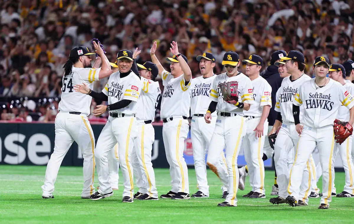 「2024 パーソルクライマックスシリーズ(CS) パ」は18日、みずほペイペイドームでファイナルステージ第3戦が行われ、リーグ優勝のソフトバンクが2位・日本ハムを3―2で下し、3試合を残して4年ぶりの日本シリーズ進出を決めた。レギュラーシーズンでは12勝12敗1分けと五分の成績だった日本ハムを相手に勝負強さを発揮し、優勝チームに与えられるアドバンテージ1勝を含めて無傷の4勝0敗。無敗での進出は昨年の阪神以来、球団としては11、15、20年に次いで4度目となった。
