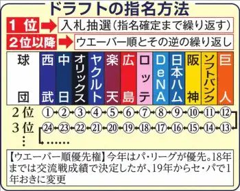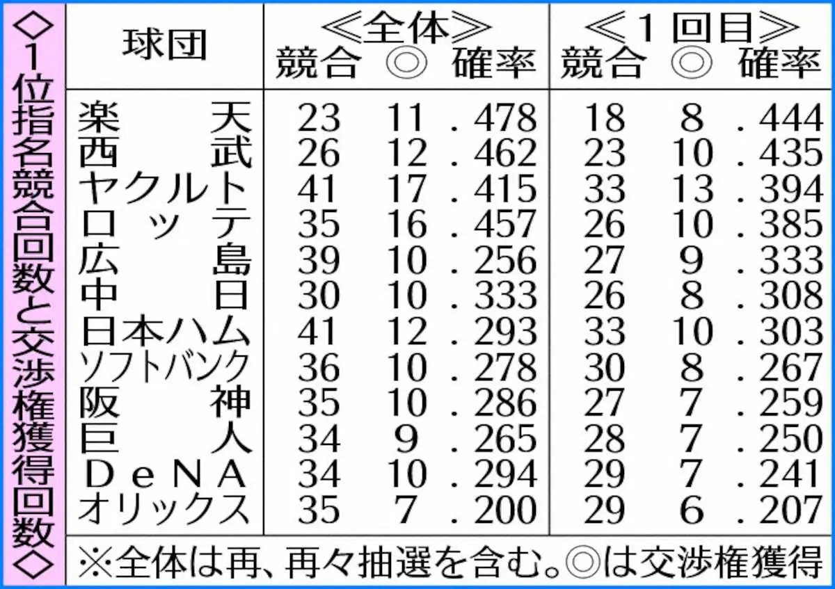 以下西武、ヤクルト、ロッテも4割を超える。一方、外れを除く1度目の抽選に限ると4割超えは楽天(.444)と西武(.435)のみ。巨人、DeNA、オリックスは.250以下となっている。