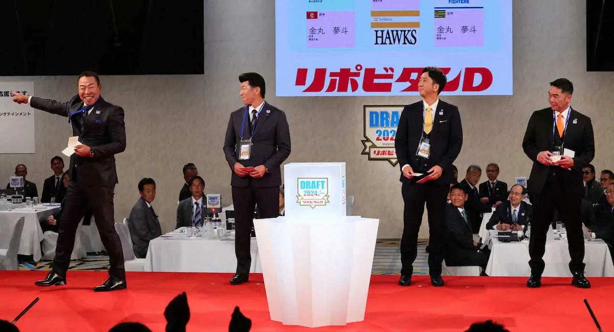 セ・リーグ4球団から1位指名。明大・宗山の5球団に次ぐ競合となった。そしてクジを引き当てたのは一番最初に引いた中日の井上一樹新監督(53)。阪神・藤川新監督、巨人・阿部監督、DeNA・三浦監督が苦笑いを浮かべる中で左腕を大きく突き上げる大ガッツポーズ。「脱臼しましたよ(笑い)。思いっきり…まさか(封筒に当たりクジが)入ってないだろうなと思った瞬間に…。(クジを開いて見せ)間違いないと思います。(見た瞬間)頭真っ白になりました。今までで多分、一番大きなガッツポーズでした。(セ・リーグの監督が)並んだ時に、どうしてもほしいな~と思いながらずっと念を送っていました」と興奮気味に語った。そして、金丸に「金丸くんの名前が、夢斗という素晴らしい名前をね…一緒に夢をかなえましょうという。待ってます!」と熱い第一声を送った。