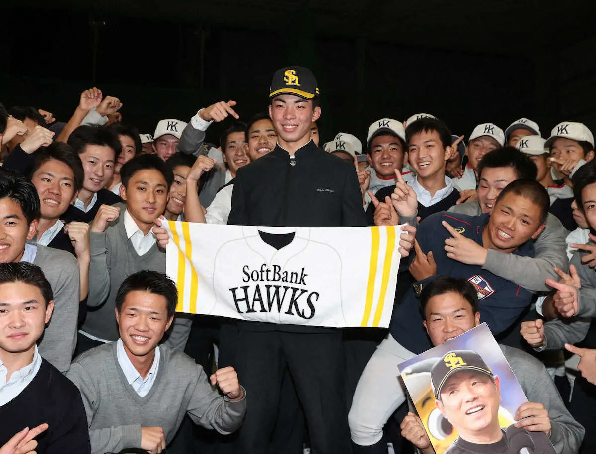 「プロ野球ドラフト会議 supported by リポビタンD」が24日、都内のホテルで行われ、ソフトバンクは1位で最速153キロを誇る神戸弘陵の右腕・村上泰斗投手(17)を指名した。宗山塁内野手(明大)、柴田獅子投手(福岡大大濠)をともにクジで外し、2年連続で高校生投手の1位指名となった。村上は昨年ドラフト1位で順調に成長中の前田悠伍投手(19)と将来の左右エースになると活躍を誓った。