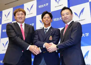 ≪宗山 森井社長、石井SDと対面「結果で応えたい」≫宗山は指名から約3時間後の午後8時に、楽天の森井社長、石井一久シニアディレクター(SD)らからあいさつを受け「結果で応えたい」と決意を新たにした。明大出身の森井社長は母校に駆けつけて「この興奮をいち早く伝えたかった。飛んできた。僕は一般的な学生だった。明大の伝統を培ってきた魅力あるプレーヤー」と絶賛。石井SDは「僕と違って爽やかですね」と言って笑わせた。