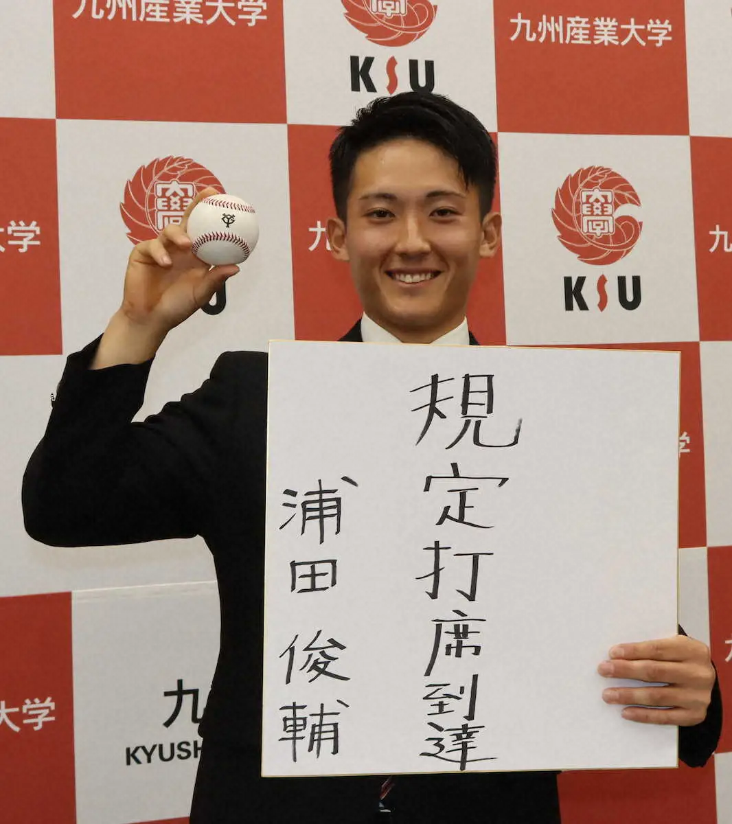 福岡六大学のスピードスター、九産大・浦田俊輔は巨人に2位指名され「伝統があり、常勝軍団の2位指名は身が引き締まる思い」と感激をあらわにした。最多の5球団が競合した明大・宗山(楽天1位)に知名度では及ばないが、全12球団から調査書が届いた俊足好打の遊撃手だ。