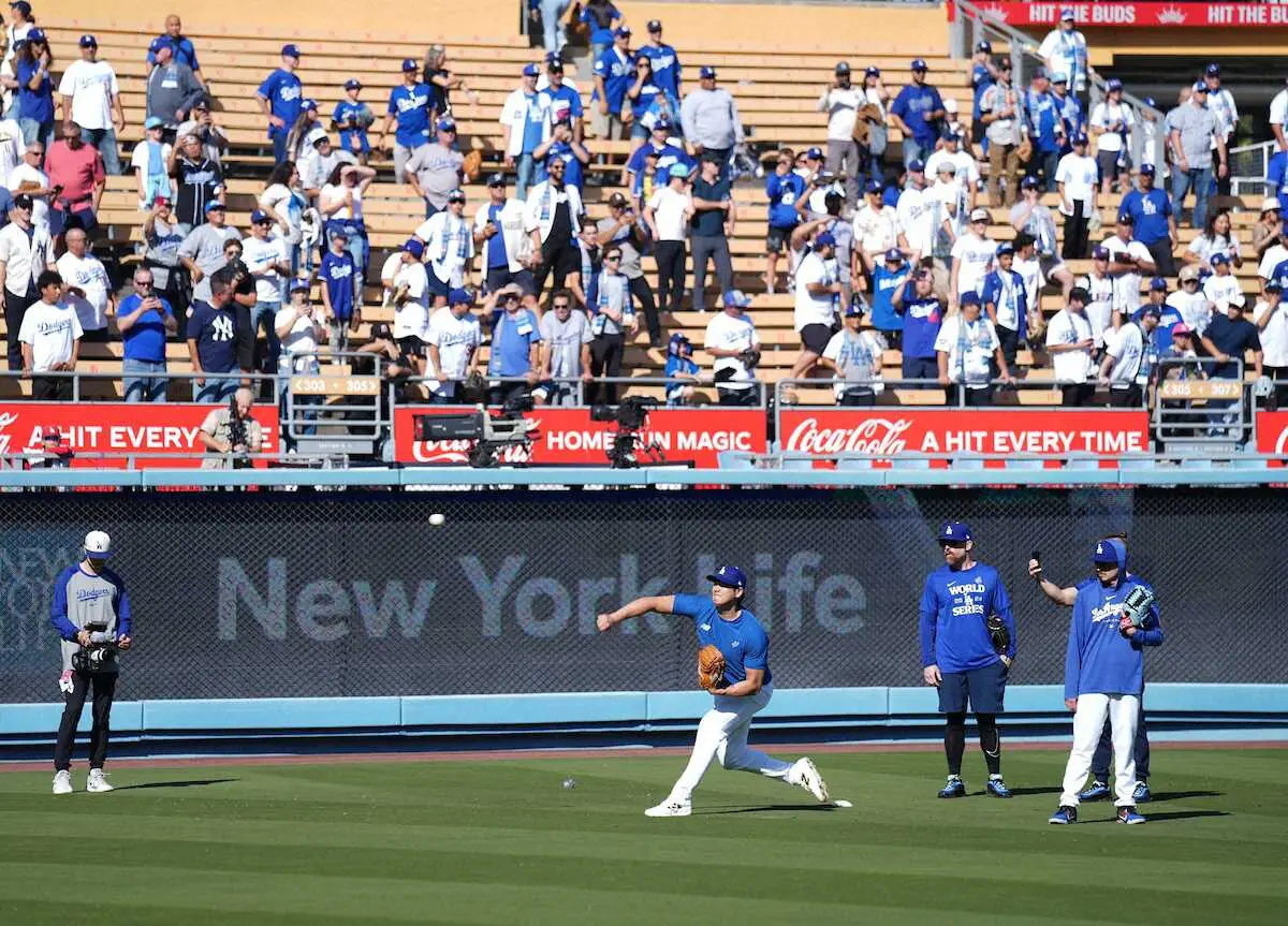 キャッチボールを終えるとボールを握ったまま、スタンドの観客に向かって右手を何度も突き上げ「エイエイオー」のポーズ。観客をあおる仕草を見せるのは珍しく、初のワールドシリーズにテンションが上がっている様子がうかがえた。