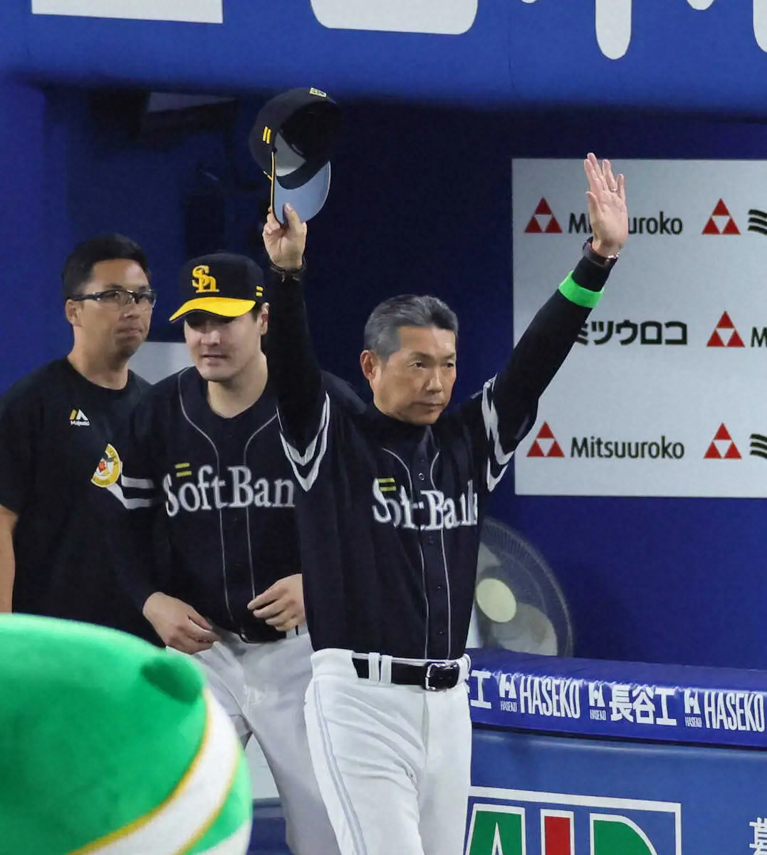 <D・ソ>ファンの歓声に応える小久保監督。左は有原(撮影・尾崎 有希)