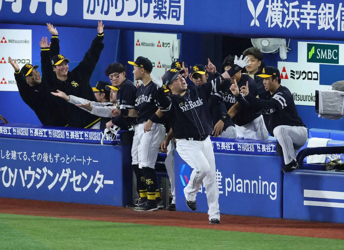 <D・ソ>DeNAに勝利し、ナインを迎えるモイネロ(後列左から2人目)と小久保監督(後列左)(撮影・平嶋 理子)