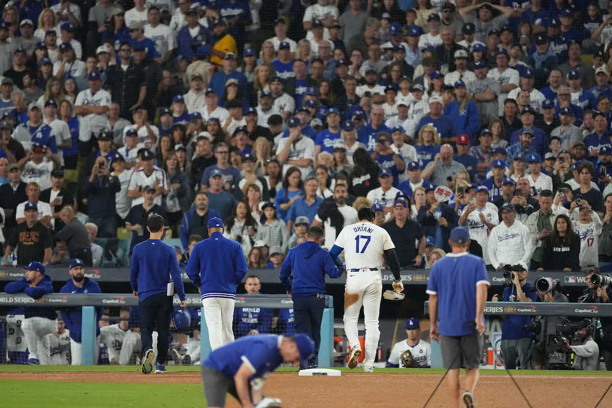 <ドジャース・ヤンキース>7回、二盗に失敗し左肩を負傷、ベンチに戻る大谷を見つめるドジャースファン(撮影・沢田 明徳)