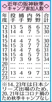 “史上最大”の先発バトルだ。阪神は、高知県安芸市で11月1日から始まる秋季キャンプに近年では最多となる20人前後の投手を同行させることを決定。藤川監督もこの日「(今は)選手の可能性を広げる時期に充てたい」と話したように、若手投手はポジションにとらわれず、まずは先発として横一線で競わせる。