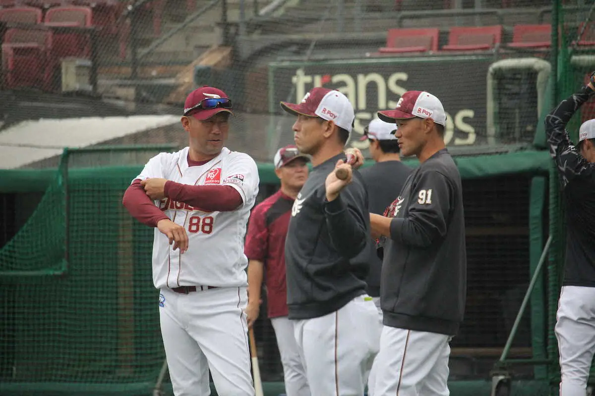 久保投手コーチ(右)らと会話を交わす楽天三木監督(撮影・花里 雄太)