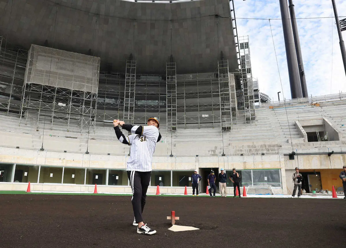 新球場となる「日鉄鋼板SGLスタジアム尼崎」にも足を踏み入れ、美しく生えそろった外野芝に感激。工事関係者とキャッチボールして激励するなど「新・虎の穴」の完成を心待ちにしていた。