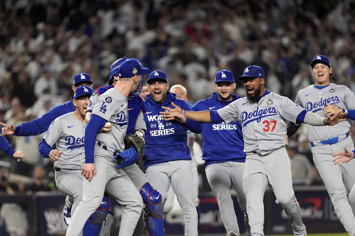 世界一に輝き、歓喜の輪をつくる大谷らドジャースナイン(撮影・沢田 明徳)