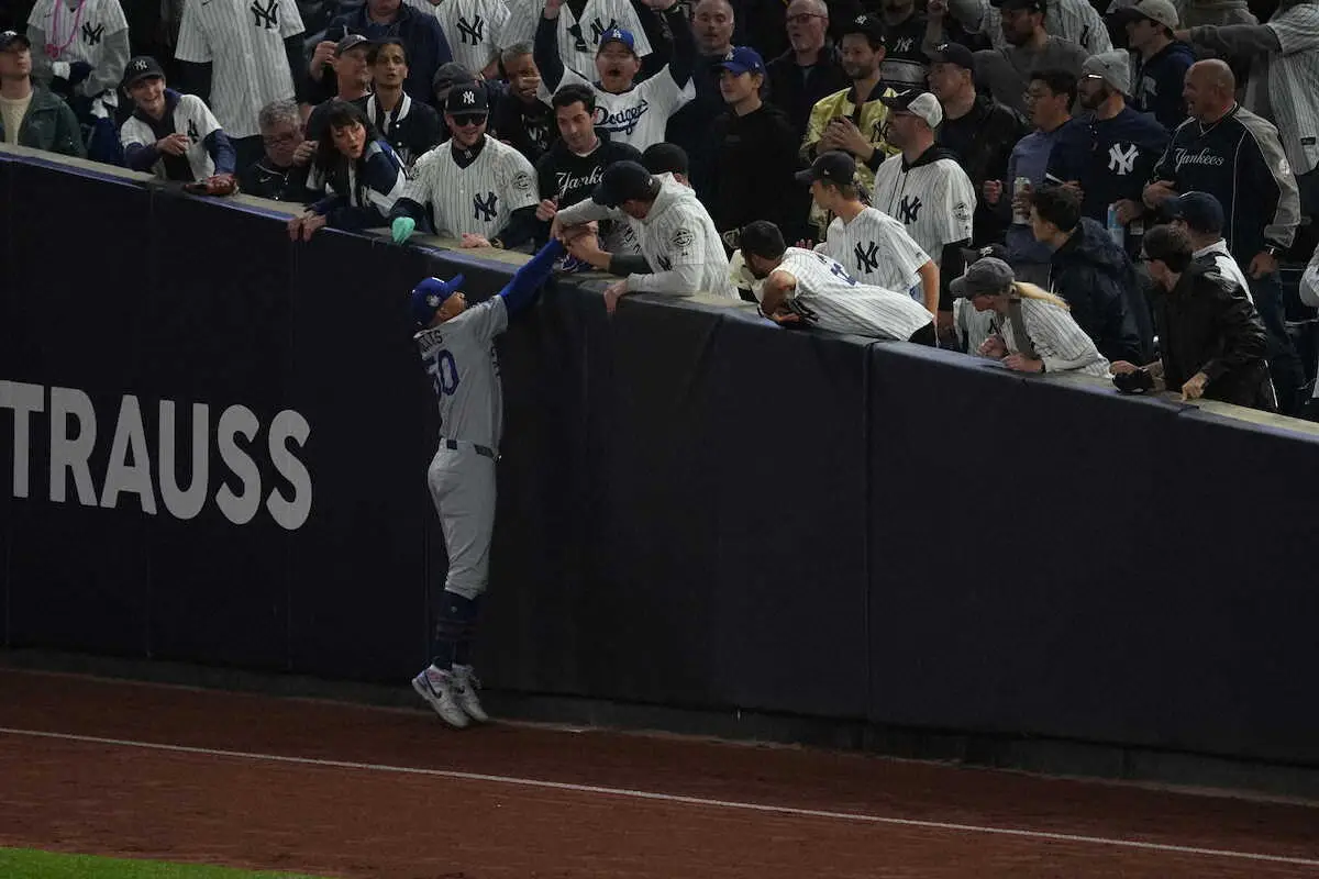 ドジャース・ベッツが初回の右翼守備でヤンキースファンから悪質な妨害行為を受けた。先頭トーレスが放った右翼ファウルゾーンへのフライを、フェンス際で客席に手を伸ばすようにして好捕。ところがヤ軍のビジターユニホームを着た男性ファンがグラブを開くようにして無理やりボールを出し、隣の男性ファンも、その行為を助けるようにベッツの右腕を引っ張った。