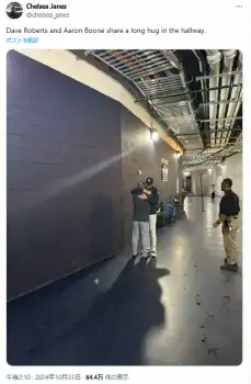 ワシントンポスト紙のチェルシー・ジェーンズ記者は自身のXで、激闘を終えた両軍監督が廊下で抱き合って健闘を称える様子を投稿。「デイブ・ロバーツとアーロン・ブーンが廊下で長い抱擁を交わす」と添えた。