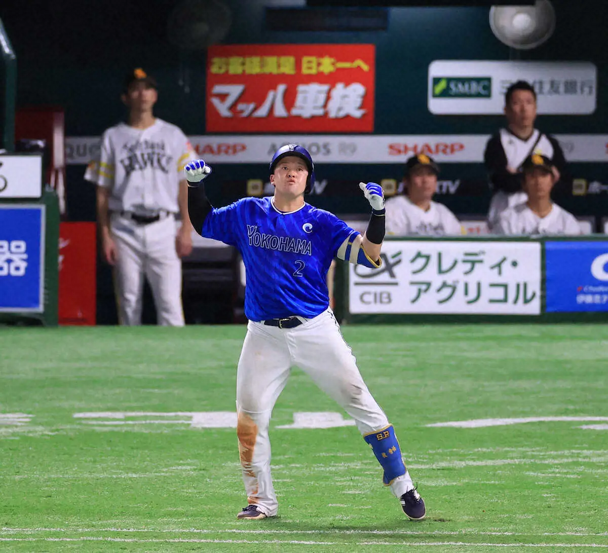1―0と先制して迎えた4回だった。先頭の桑原がしぶとく遊撃への内野安打で出塁。続く梶原も遊撃への内野安打で一、二塁とチャンスをつくった。すると牧が相手3番手・前田純の甘く入った直球を強振。高々と上がった打球はDeNAファンの待つレフトスタンドに着弾。圧巻の3ランで貴重な追加点を叩き出すと、両手でガッツポーズをつくり喜んだ。
