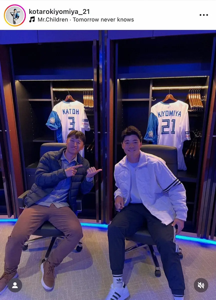 清宮は、「#現役生活お疲れ様でした#ロッカーはいつも隣」とハッシュタグをつけ、本拠地・エスコンフィールド北海道のロッカールームで撮影した加藤とのツーショットを披露。2人は、掲げられたユニフォームの前で満面の笑みを見せている。