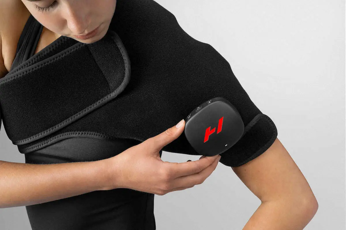 この“機械”は、Hyperice社製の「Venom 2 Shoulder」。手元で調節できる3段階の温度調節と、3段階の振動パターンの組み合わせが可能で、同社の日本総代理店「アルコインターナショナル」の担当者は「ウオームアップの強化や筋肉痛の軽減、可動域の拡大をサポートします」と効果を説明した。