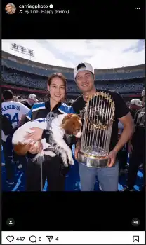 ド軍カメラマン 大谷翔平&真美子さんが肩寄せ合う家族ショット披露 真美子さんはデコピンを抱っこ