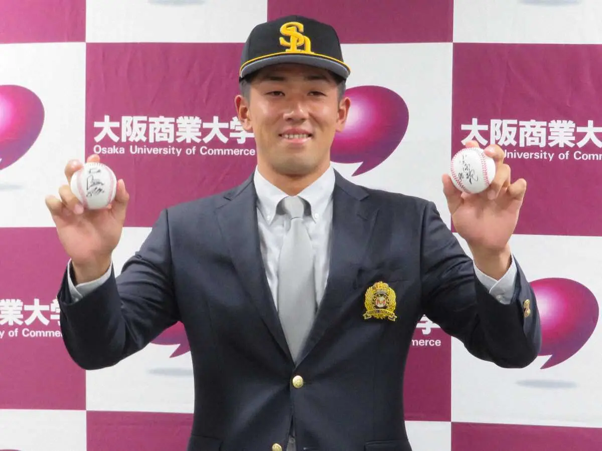 1メートル87の長身から投げ下ろす151キロ直球とマウンド度胸が魅力の右腕は、王貞治会長(84)と小久保裕紀監督(53)のサインボールを手に「ソフトバンクは育成で指名されても、頑張れば支配下で活躍できる環境にある」と千賀洸大投手(31=現MLBメッツ)や石川柊太投手(32)らが築いてきた道を進む覚悟を話した。