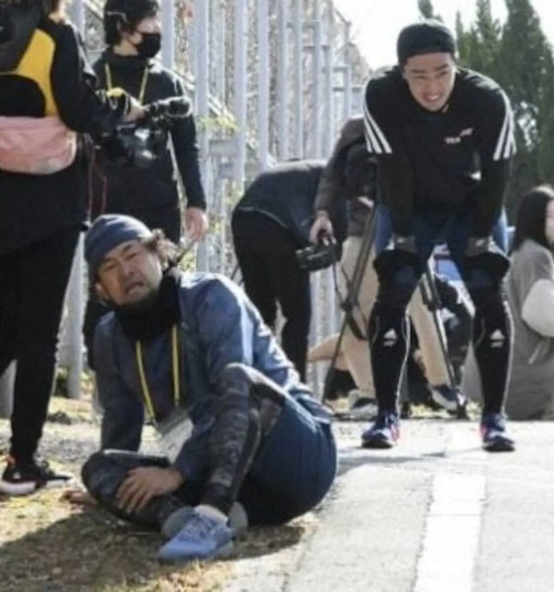 23年、ソフトバンク・和田(右)の自主トレで一緒に走り疲労困ぱいのスポニチ井上記者(左手前)