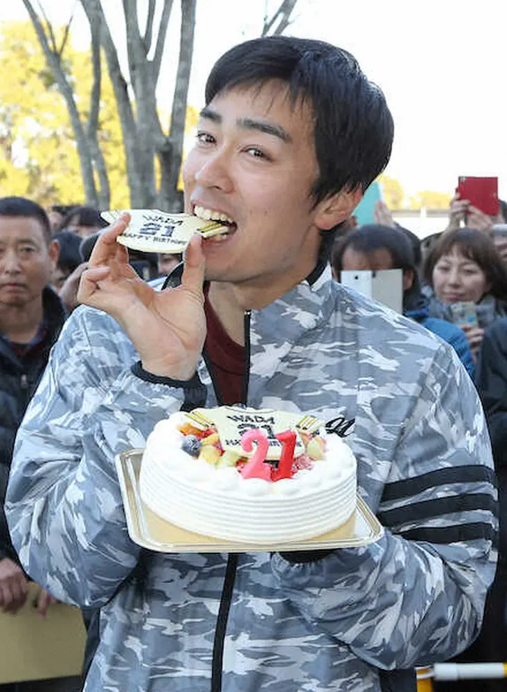17年春季キャンプ、誕生日に報道陣からケーキを贈られたソフトバンク・和田(撮影・岡田 丈靖)