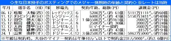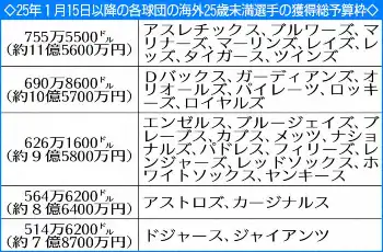 ▽ポスティングシステム 海外FA権取得前に大リーグに移籍する制度。現在は入札ではなく、獲得を希望する全球団と交渉できる。申請期間は11月1日から12月15日までで、申請手続き後の交渉期間は45日間。日本球団への譲渡金は選手が契約で保証される額により変動する。マイナー契約での譲渡金は、契約金の25%。メジャー契約では保証額のうち2500万ドル(約38億2500万円)までの部分の20%、2500万~5000万ドル(約76億5000万円)の部分の17.5%、5000万ドルを超えた部分の15%の合計となる。