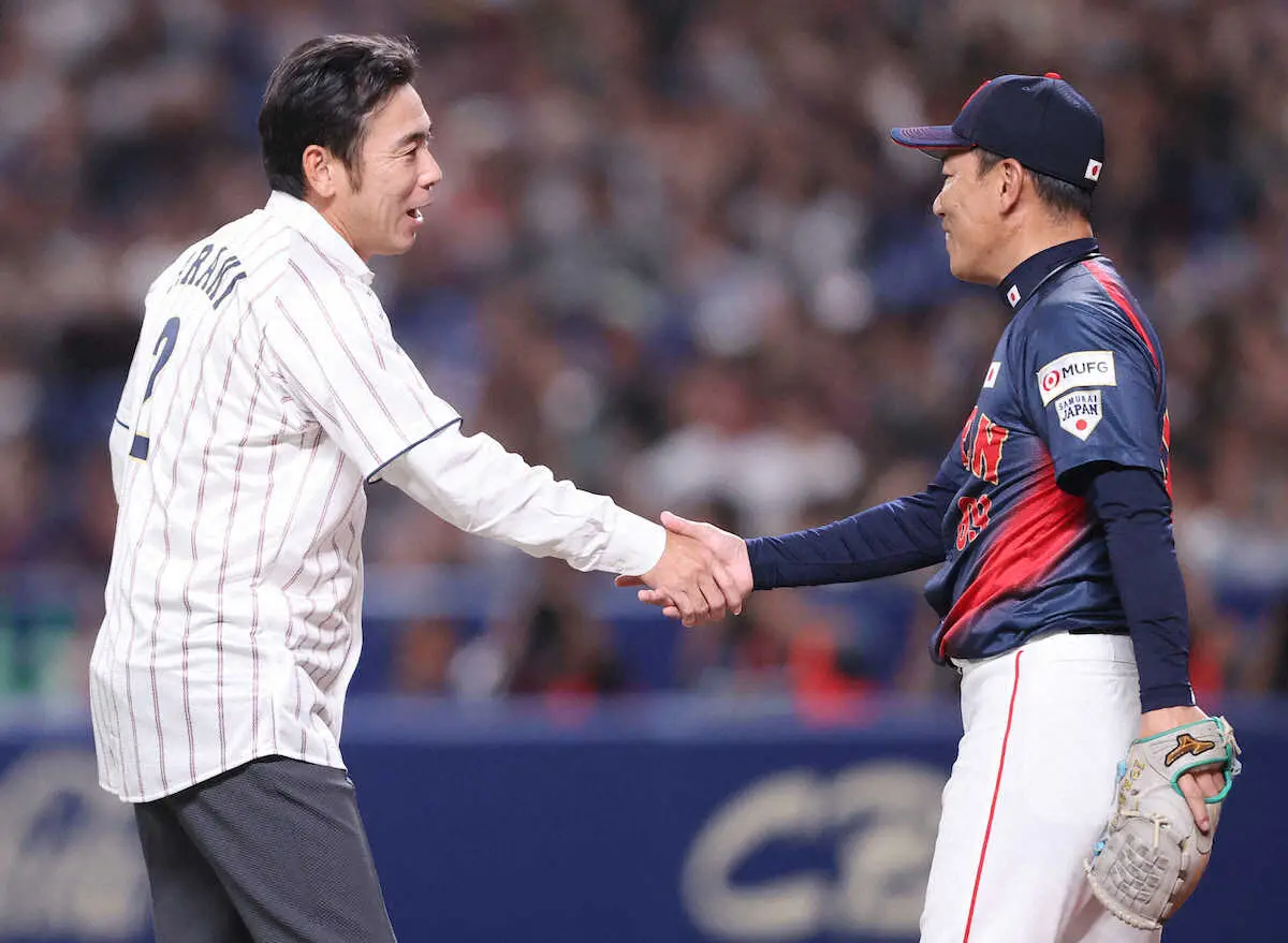 捕手役は井端監督が務めたが、ノーバウンドで外角ギリギリに投げ込み、2人でガッチリ握手。バンテリンドームからは大きな拍手が起きた。