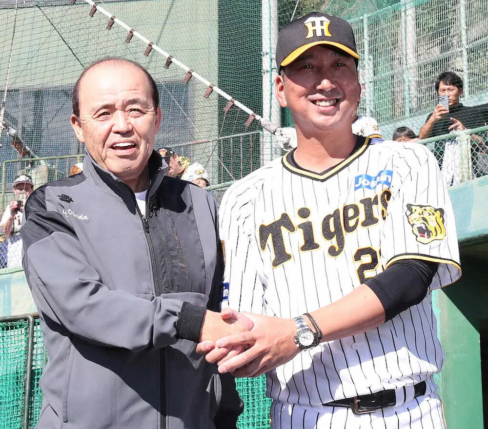 阪神・藤川監督(右)と握手を交わす岡田オーナー付顧問(撮影・須田 麻祐子)