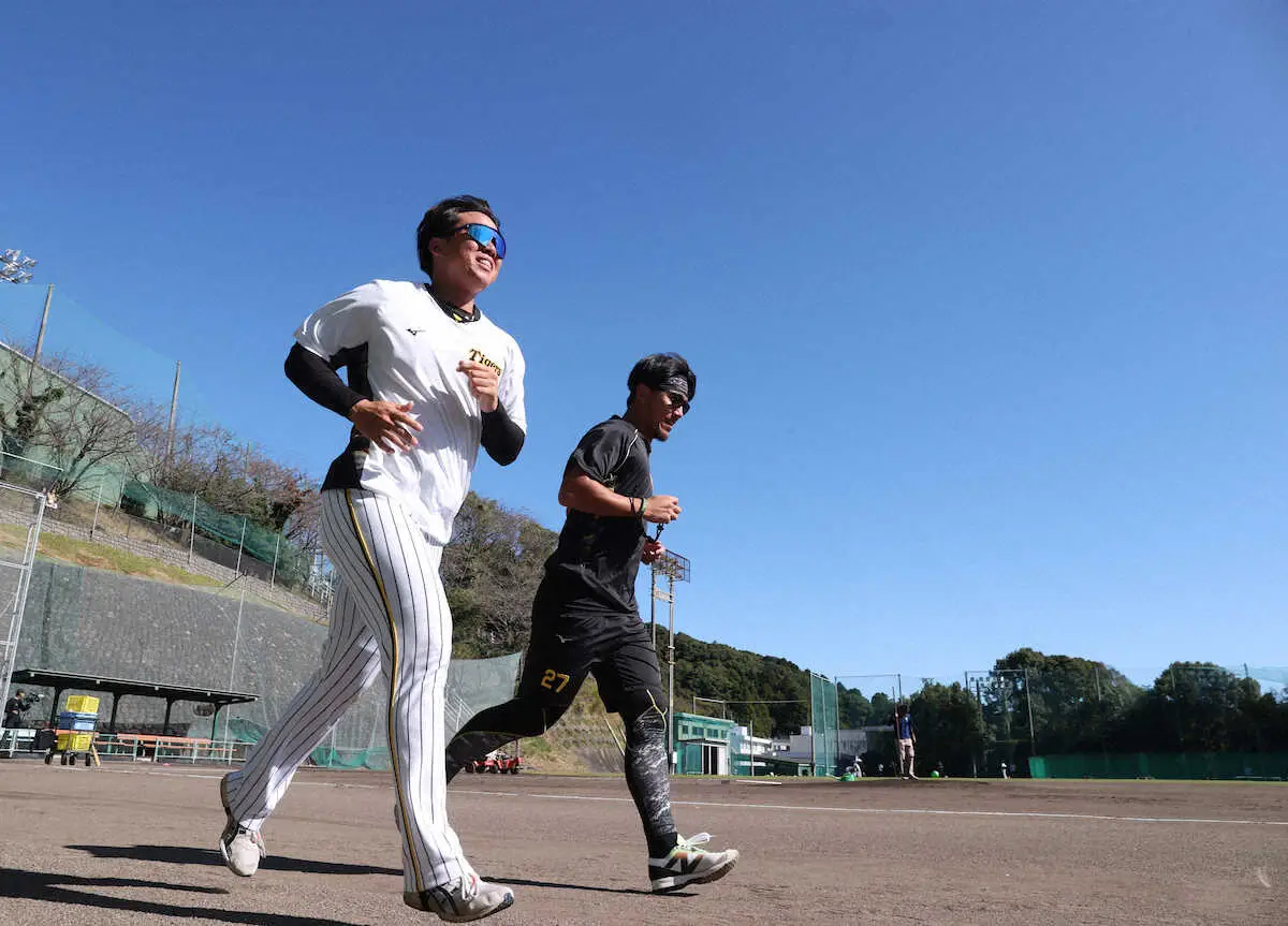 青空の下走り込む阪神・村上(左)と伊藤将(撮影・大森 寛明)