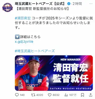 元ロッテ・清田育宏氏 BC埼玉の監督に就任「“優勝”“NPB輩出”の目標を果たしていきたい」