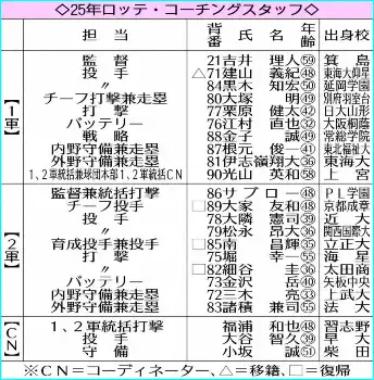 福浦和也ヘッド兼打撃コーチ(48)は1・2軍統括打撃コーディネーターとなり、小野晋吾1軍投手コーチ(49)はスカウトに転身する。