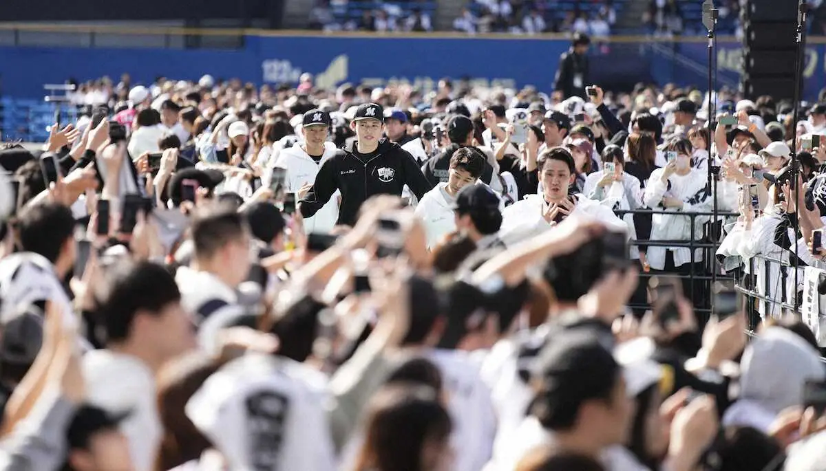 公の場で言葉を発するのはCSファーストステージ初戦の10月12日以来36日ぶりで、正式にメジャー挑戦することが決定してからは初めて。佐々木は壇上に上がると、多くのファンから拍手で迎えられた。佐々木は「チーム・ブラック」の一員として黒のパーカーに身を包み、壇上では他のナインとともに笑顔を浮かべた。