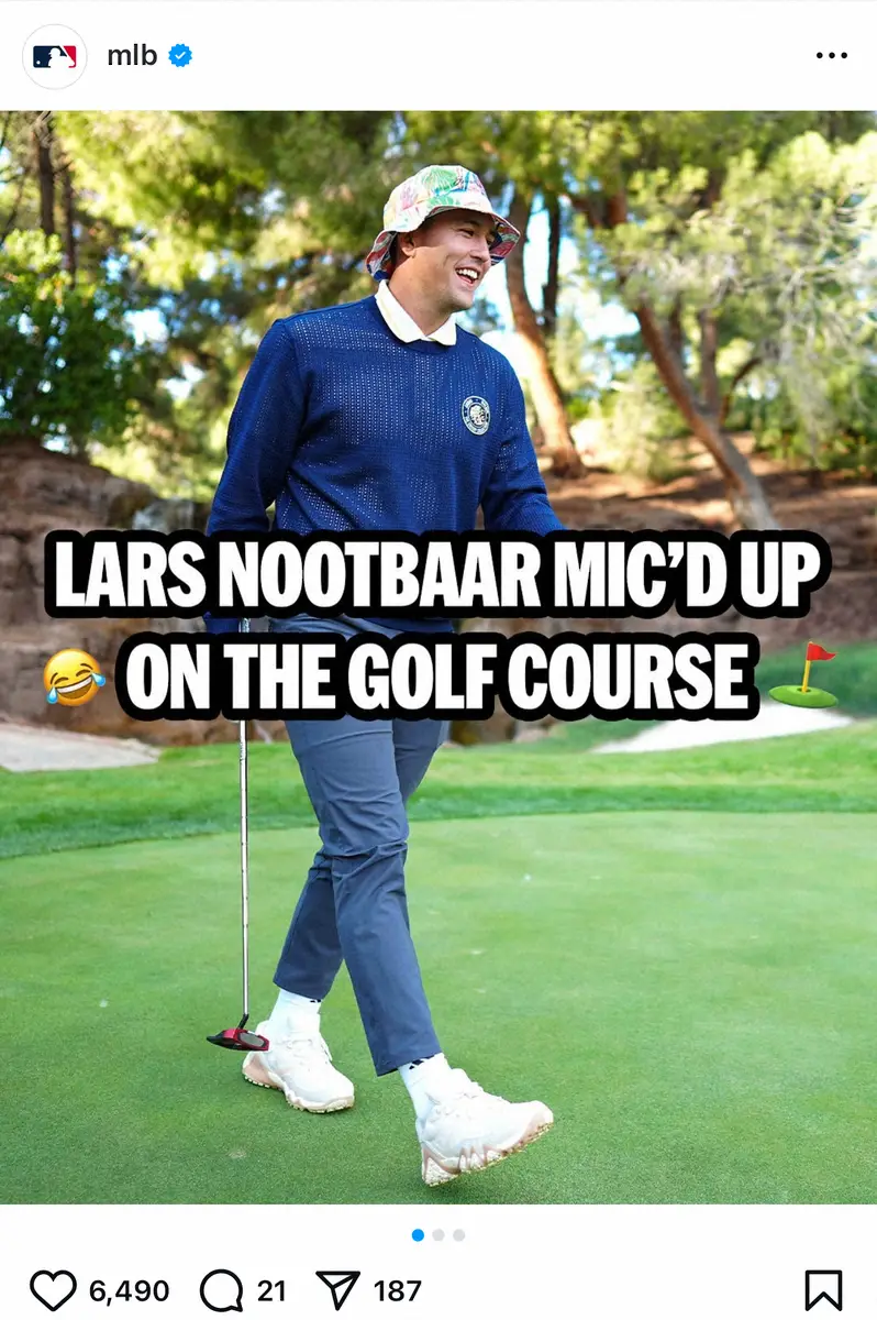 MLB公式SNSが17日(日本時間18日)更新され、カージナルスのラーズ・ヌートバー外野手(27)がゴルフに挑戦する様子が公開された。