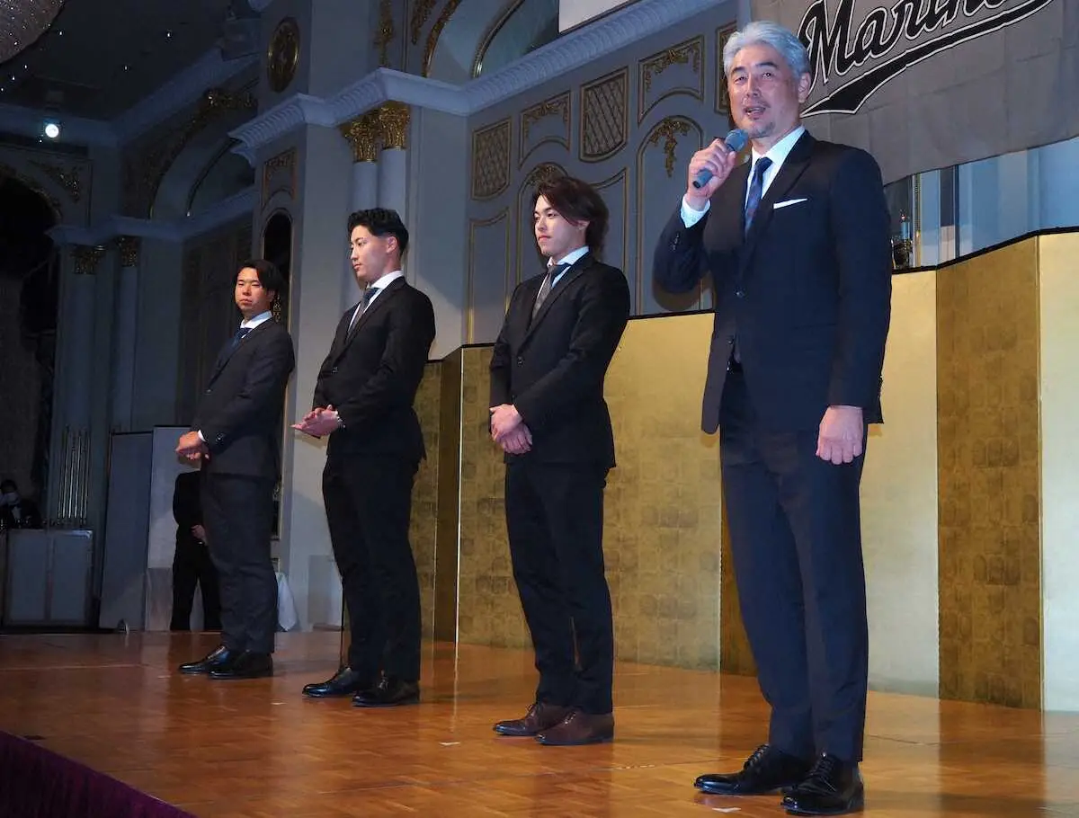 千葉県内経済界による千葉ロッテマリーンズの後援団体「かもめ会」の会員の集いが19日、千葉市内のホテルで開かれ、吉井理人監督、小川龍成内野手、菊地吏玖投手、上田希由翔内野手の3選手が出席した。