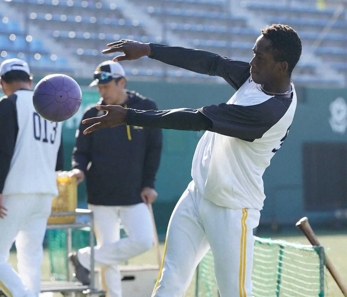 メディシンボールを投げるソフトバンクのイヒネ(撮影・岡田 丈靖)