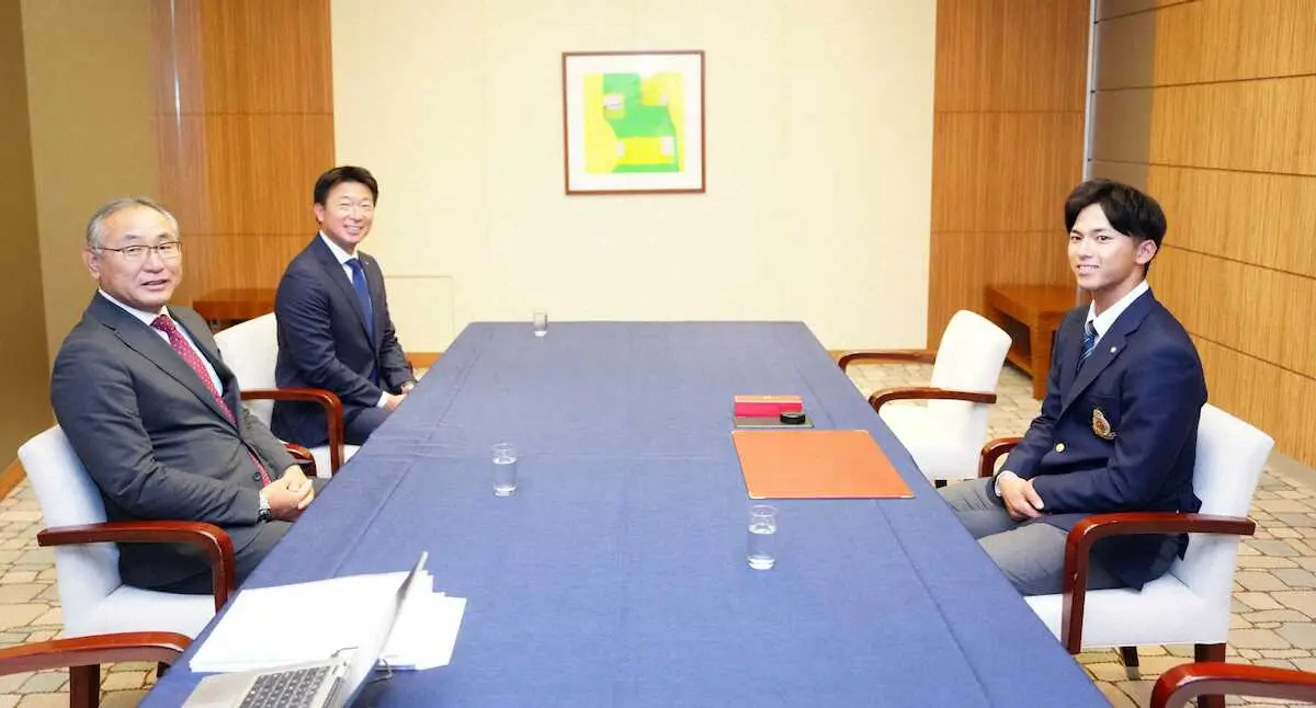 <楽天ドラ1 宗山仮契約>仮契約を終え、沖原スカウト(左)に背番号「1」の色紙を当ててもらいガッツポーズする宗山(撮影・木村 揚輔) Photo by スポニチ 楽天ドラ1の明大・宗山が入団交渉に臨み、基本合意 ギャラリーで見る この記事のフォト 2024年11月20日の画像一覧 もっと見る 2024年11月20日の画像をもっと見る