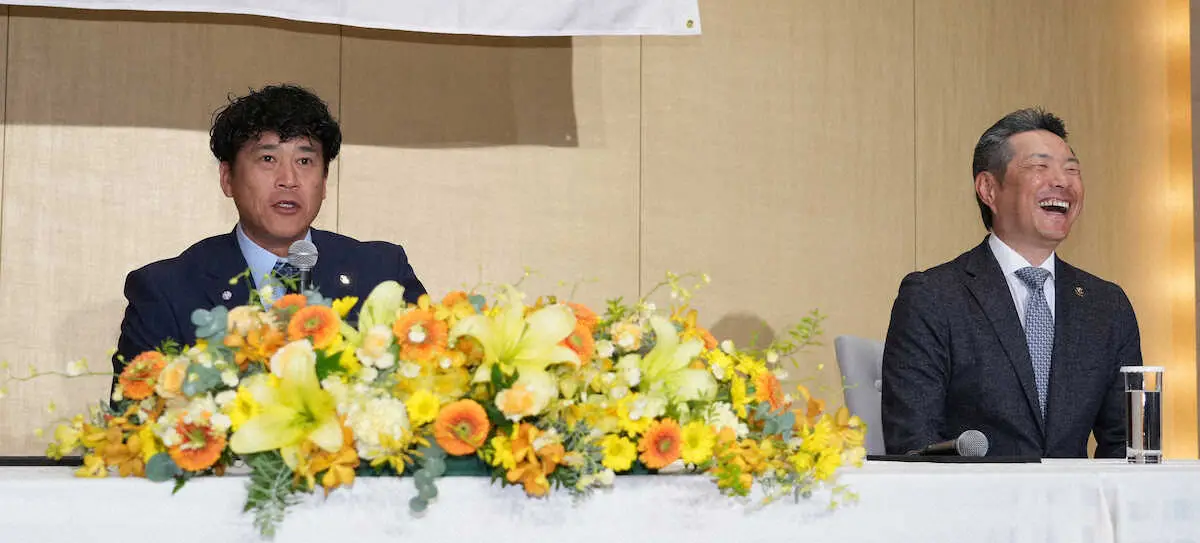 <ソフトバンク城島CBO就任会見>小久保監督(右)と会見を行う城島CBO(撮影・岡田 丈靖)