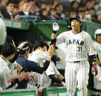 プレミア12スーパーラウンド<日本・ベネズエラ>6回2死満塁、牧は勝ち越しの満塁本塁打1。ナイン総出のデスターシャ(撮影・長久保 豊) Photo by スポニチ 【プレミア12】牧秀悟の勝ち越し満塁弾で謎の「ターシャ」がXトレンド入り… ギャラリーで見る この記事のフォト 2024年11月22日の画像一覧 もっと見る 2024年11月22日の画像をもっと見る