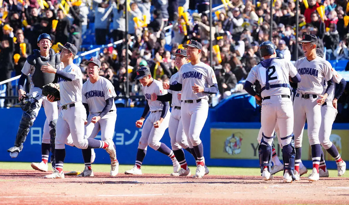 延長11回に横浜は4番・小野の遊ゴロの間に勝ち越し点を、さらに5番・奥村の左前適時打で2点を挙げると、エース左腕・奥村頼人(2年)が東洋大姫路の無死満塁の攻撃を無失点で切り抜けて勝利。決勝進出を決めた。
