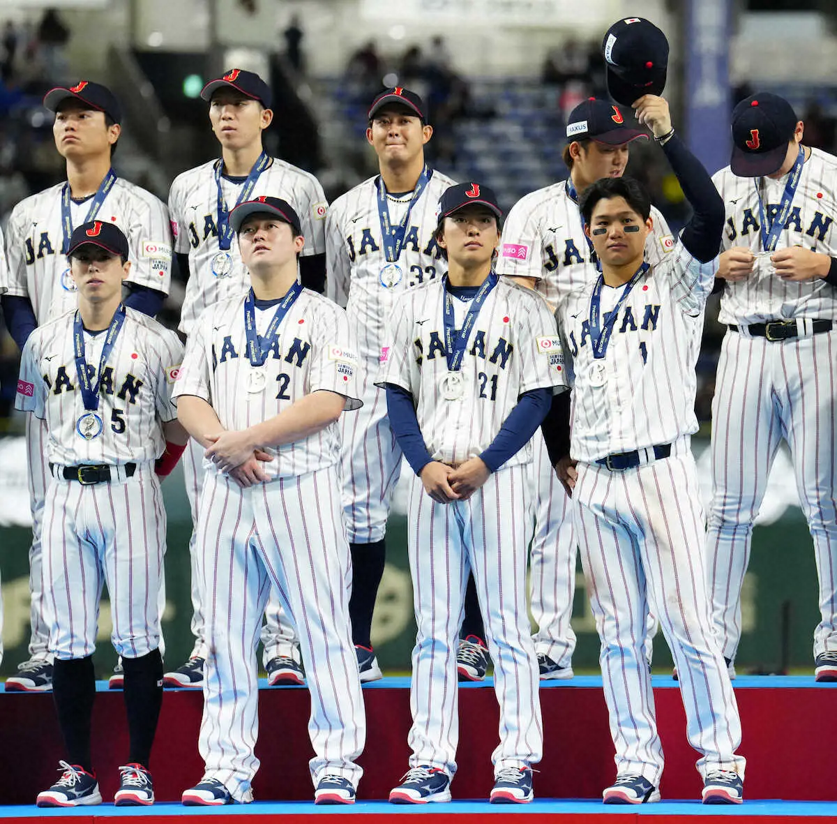 <日本・台湾>声援に応える森下、早川、牧、佐藤都、戸郷ら侍ジャパンナイン(撮影・島崎 忠彦)