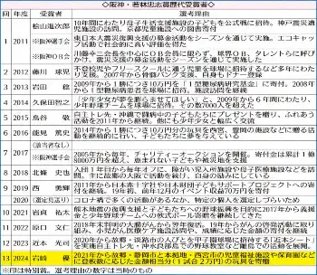 ▽若林忠志賞 阪神が社会貢献・慈善活動やファンサービスに継続的に取り組み、優れた見識を持つ自チームの選手を表彰する精度。2011年7月創設。球団創設時から活躍し、グラウンド外の活動でプロ野球選手の模範となった元投手・監督、若林忠志氏(1908―65年)の功績をたたえ命名した。毎年オフ、選手1人を表彰、記念の盾と賞金100万円、活動資金100万円を贈る。