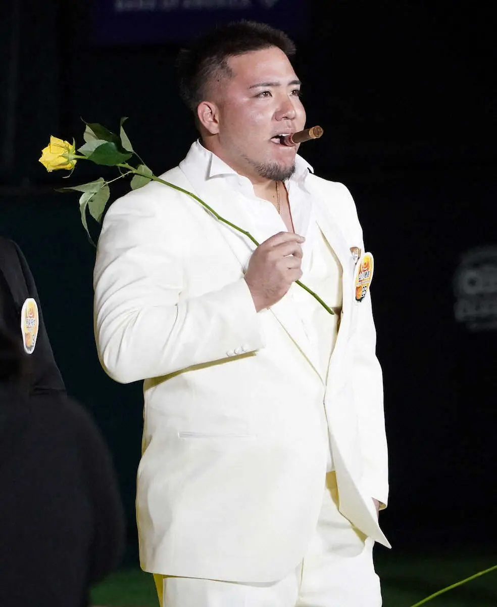 ソフトバンク・山川 白いスーツに葉巻をくわえて…似合いすぎ!?