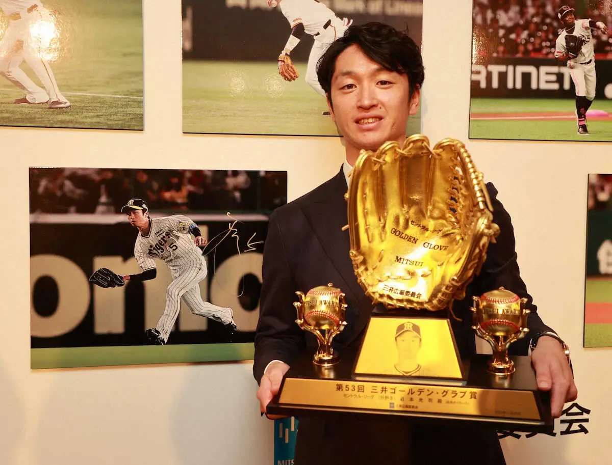 黄金のグラブを胸に抱き、近本は誇らしげに壇上に立った。4年連続4度目の勲章。常連のオーラを漂わせ、まぶしいスポットライトを一身に浴びた。