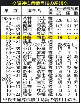 日本球界のエースナンバーといえる18は、球団では17年ドラフト1位の馬場が現役ドラフトで巨人に移籍した23年まで付け、今季は空位になっていた。歴史をひもとけば、球団創成期の猛虎のエースで、社会貢献に熱心だった若林忠志が初代。野田浩司、藪恵市らが受け継ぎ、16年には藤川監督も1年だけ背負った。伊原が21代目。不思議なことに、猛虎では左腕投手に縁が薄い番号で、56~58年まで付けた井崎(後に前岡)を最後に出ていなかった。来季、実に67年ぶり2人目の「18番のサウスポー」が誕生することになる。