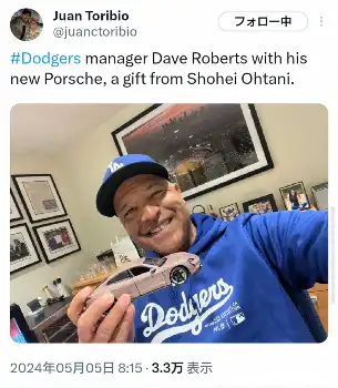 チームは今年、4年ぶりにワールドシリーズを制覇。この日の会見で改めて世界一になったことで大谷から本物のポルシェをもらったかどうか尋ねられた指揮官は「大谷選手がドジャースに入団する際にジョー・ケリー選手が17番を譲ってくれたことによって、ポルシェをプレゼントしたところから始まりました」と経緯を説明し「球団の日本生まれの選手の最多本塁打に並んだ記念にギフトとしておもちゃのポルシェをプレゼントしてくれました。本物はどこだ?と話したら、“世界一になったら渡す”と言われた」と続けた。