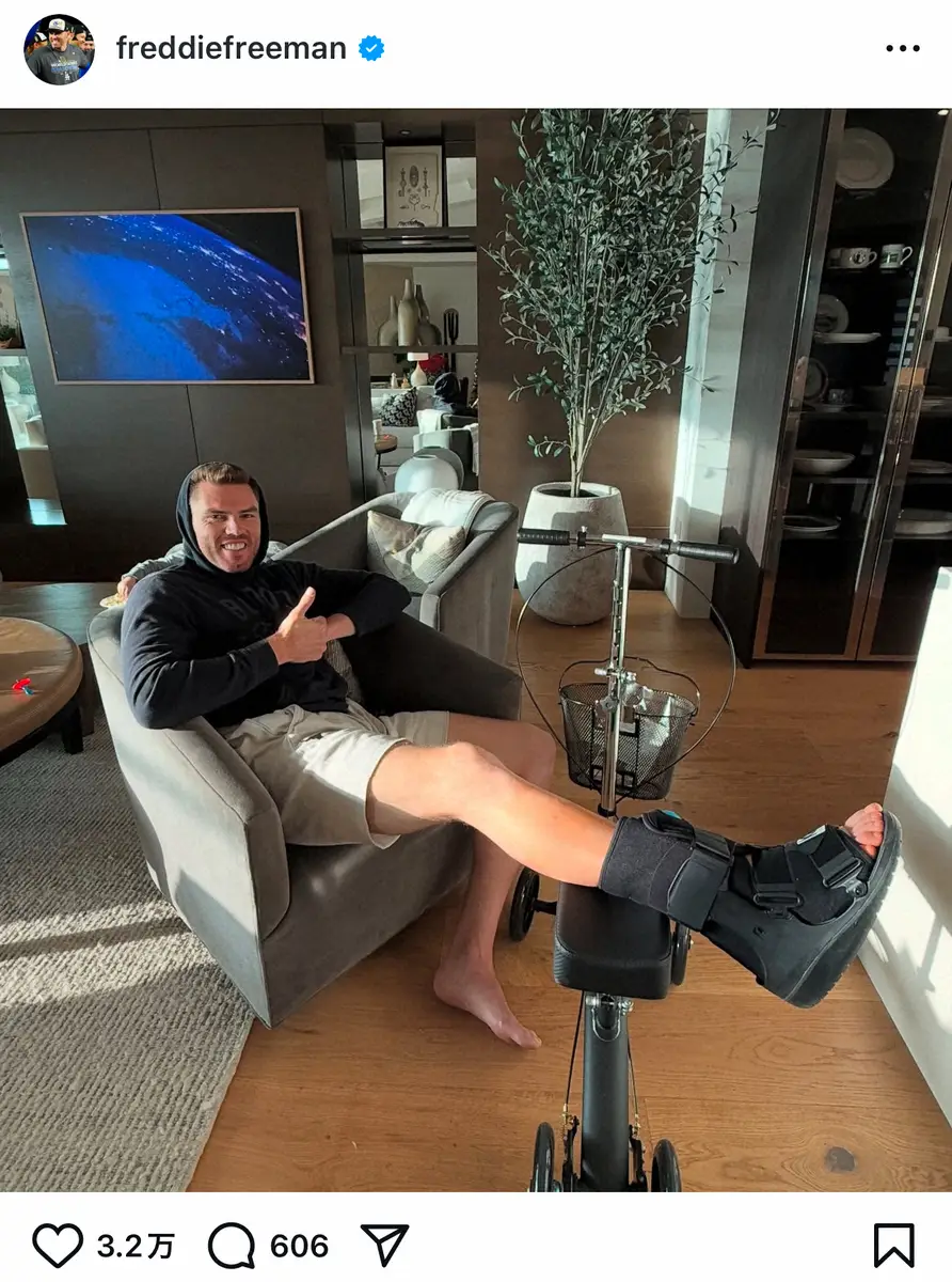 投稿では、椅子に座ったフリーマンが歩行用ブーツ(サポーター)を着用した右足を台に乗せている写真をアップ。笑顔でサムズアップをしている。