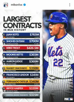 SNS上では、ソトの超大型契約を受け、米FOX局は公式インスタグラムで過去の大リーグの大型契約トップ10を紹介。4位ベッツの12年総額3億6500万ドル(約547億5000万円)と5位ジャッジの9年総額3億6000万ドル(約540億円)を足しても今回のソトの契約額に届かないことで驚きの声があがった。「ソトの契約金はジャッジとベッツを合わせた金額よりも高い。全く異常だ」「ソトは2選手分の価値に値しない」「ソトはすぐにDHになるだろう。嫌っているわけではないが、ベッツ、トラウト、ジャッジが3~4億ドルの範囲にあるのに、ソトは高すぎる」などのコメントがあった。