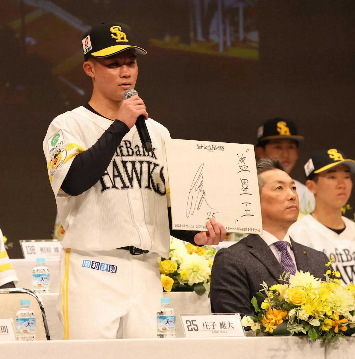 ソフトバンク新入団会見で、小久保監督(右)の隣で「盗塁王」と目標を記した庄子(撮影・成瀬 徹)